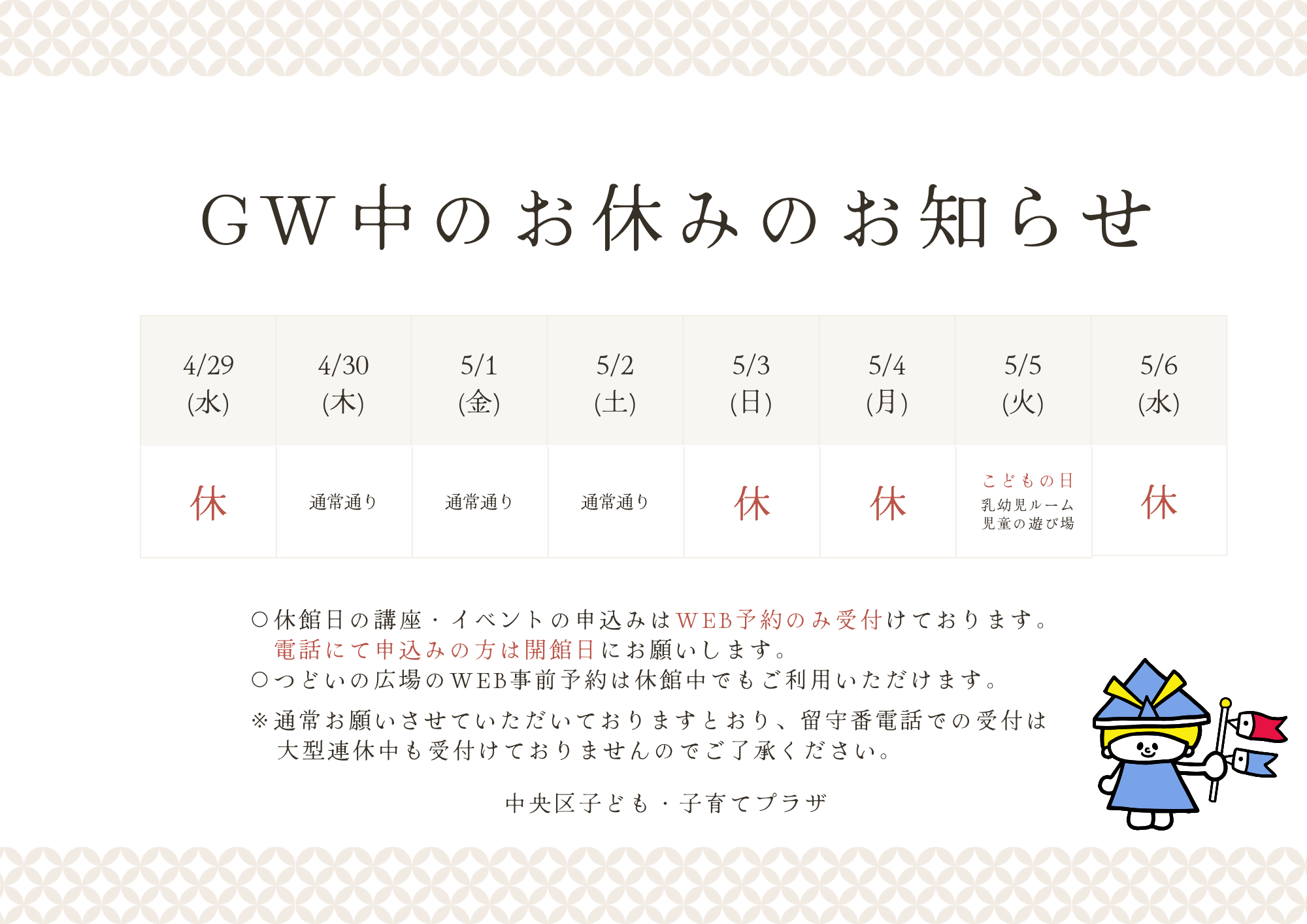 【つどいの広場】はお休みになりますので、ご注意ください。