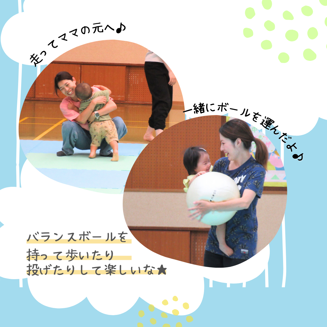 この日の参加者はみんな同級生(1歳☆)だったので、月齢で少し運動差が出るのが当たり前ですが、みんな力強く歩いて、ボールを運んで蹴って投げて…と楽しく遊びんでいました^^